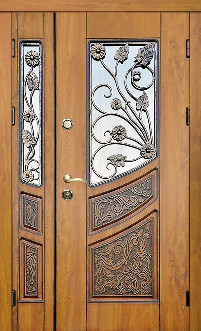 Дверь со стеклопакетом входная №411 создана для тех, кто ценит надежность и одновременно хочет подчеркнуть стиль фасада своего дома. Прочный стальной каркас из профильной трубы с листом металла толщиной 2 мм и системой ребер жесткости гарантирует долговечность и защиту от внешних воздействий. Панели из натурального дерева с обеих сторон придают полотну благородный облик, устойчивый к царапинам и погодным перепадам, сохраняя первоначальный вид долгие годы. Стеклопакет не только украшает дверь, но и наполняет прихожую естественным светом, создавая уют и ощущение открытости. Два контура уплотнителей предотвращают сквозняки и влагу, а встроенные блокираторы усиливают защитные функции. Такая модель удачно совмещает декоративность и практичность, делая парадный вход в коттедж или частный дом одновременно безопасным и выразительным. Дверь со стеклопакетом входная №411 от производителя: быстрое изготовление и монтаж в Мытищах, индивидуальные размеры, широкий выбор материалов и фурнитуры, официальная гарантия до 10 лет.