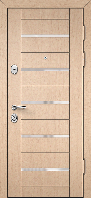 Эта бронированная дверь в современном дизайне №28 станет отличным решением для частного дома, квартиры или офиса, предлагая надежную защиту и стильный внешний вид. Ее конструкция включает каркас из профильной трубы 50х25 мм и металлическое полотно толщиной 2 мм, что обеспечивает прочность и долговечность. Внешняя и внутренняя отделка выполнены из плиты МДФ, придающей двери современный вид и стойкость к механическим повреждениям. Хотя терморазрыв отсутствует, конструкция с терморазрывом коробки и полотна помогает снижать теплопотери. Дополнительную безопасность обеспечивают два замка — сувальдный и цилиндровый, оба с тремя ригелями. В дверь можно добавить зеркало, стеклопакет или кованые элементы, а также установить видеодомофон, что делает эту модель максимально универсальной и индивидуальной. Бронированная дверь в современном дизайне №28 от производителя: быстрое изготовление и монтаж в Мытищах, индивидуальные размеры, широкий выбор материалов и фурнитуры, официальная гарантия до 10 лет.